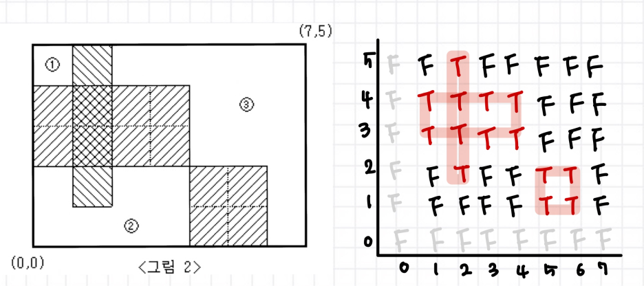 이과정을 거치면 왼쪽과 같은 모눈종이가 오른쪽과 같은 배열로 변환된다. (F = false / T= true )