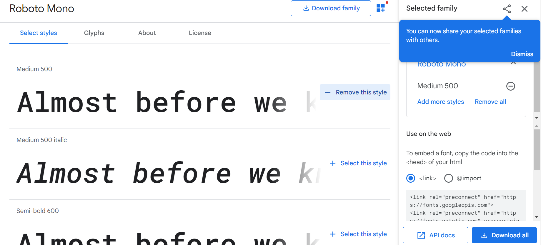 원하는 폰트를 선택하면 된다. 본인은 Roboto Mono 폰트의 Medium 500크기를 선택했다.