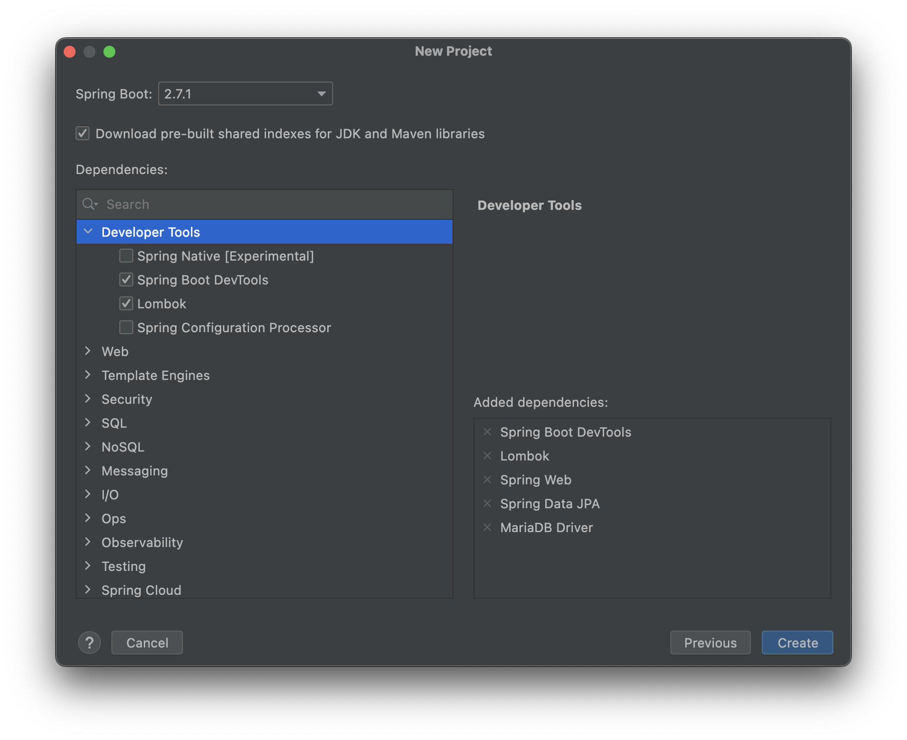 이후 Spring Boot DevTools, Lombok, Spring Web, Spring Data JPA, MariaDB Driver