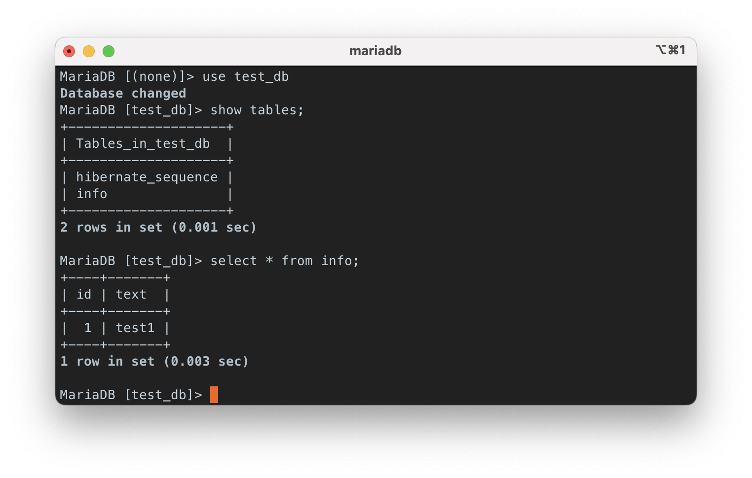 우선 터미널을 열고 위의 명령어를 입력하면 mariaDB가 실행된다.