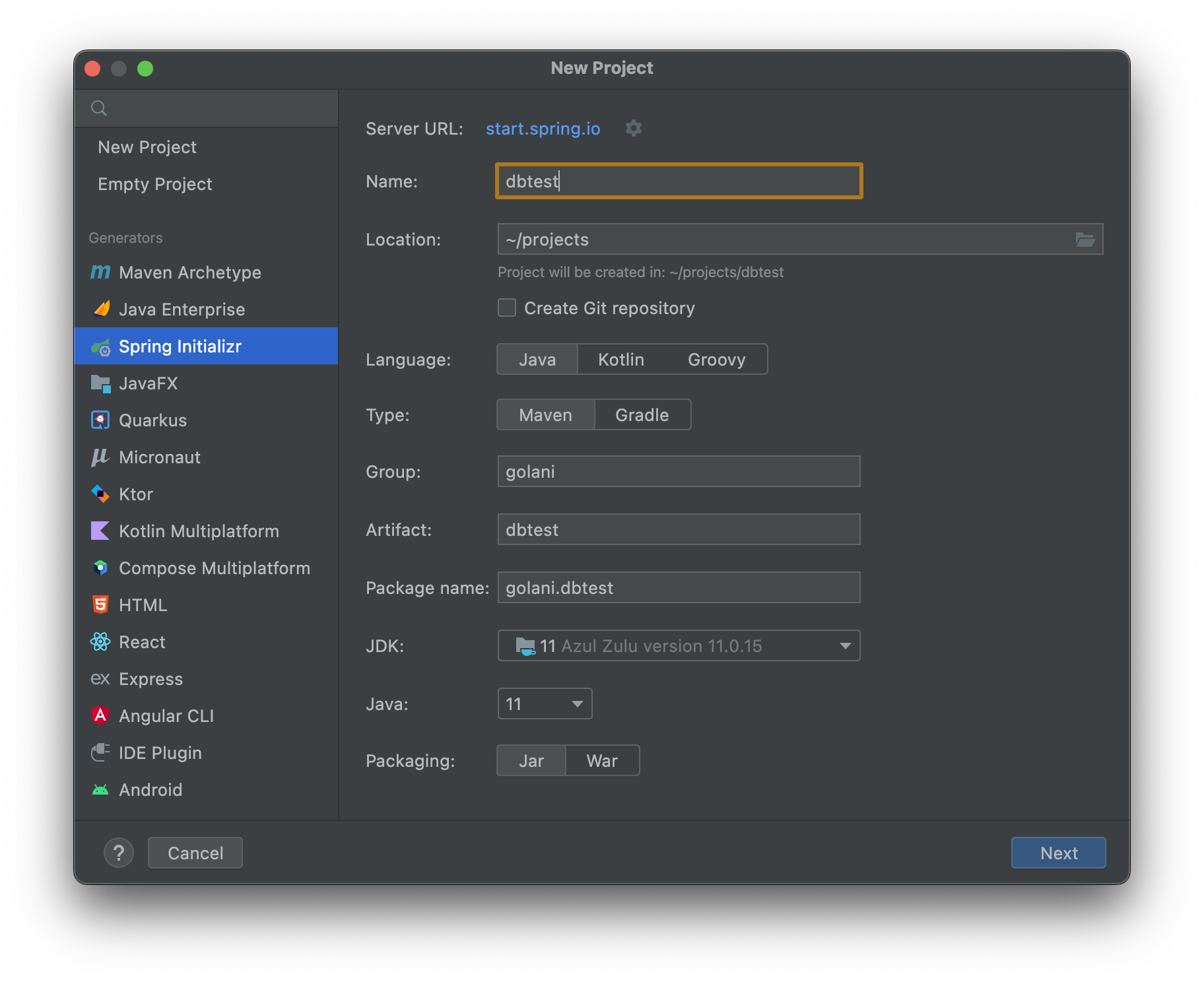 group, projct Name을 설정해주고, opnJDK 11를 선택후 Next를 눌러준다.