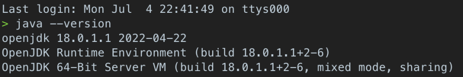 18.0.1.1 (arm64) "Oracle Corporation" - "OpenJDK 18.0.1.1" /Users/'사용자이름'/Library/Java/JavaVirtualMachines/openjdk-18.0.1.1/Contents/Home