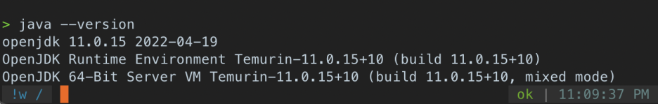 11.0.15 (arm64) "Eclipse Adoptium" - "OpenJDK 11.0.15" /Library/Java/JavaVirtualMachines/temurin-11.jdk/Contents/Home
