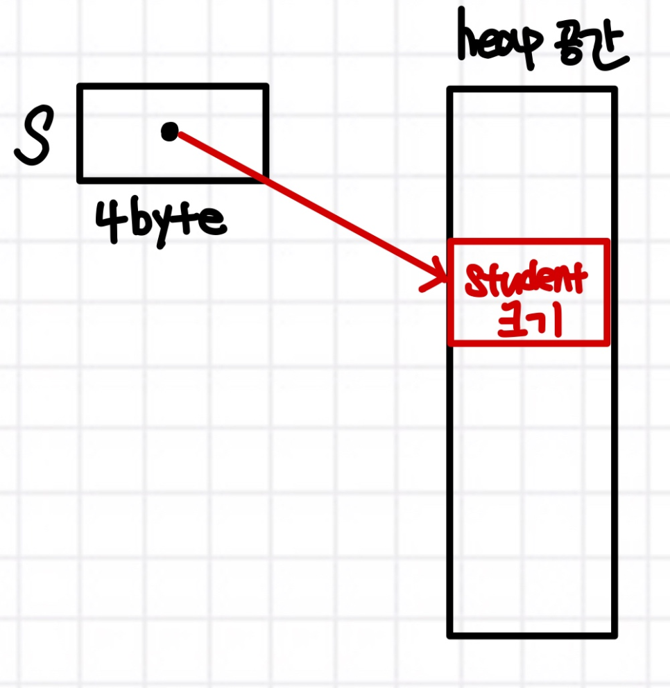 그리고 이 공간은 다시 heap에 있는 실제 Student만큼의 객체 크기 만큼 할당한 부분을 가리킨다.